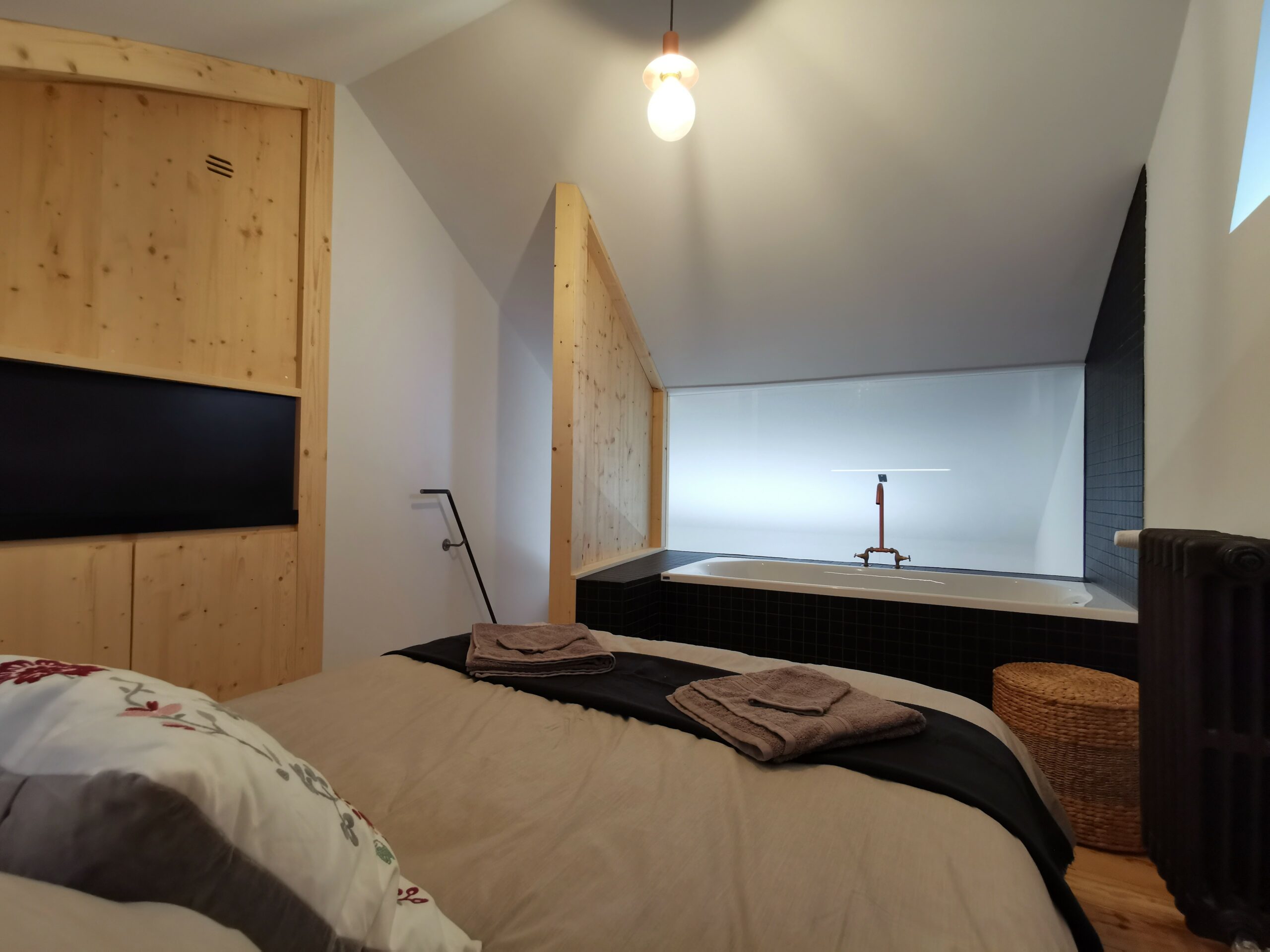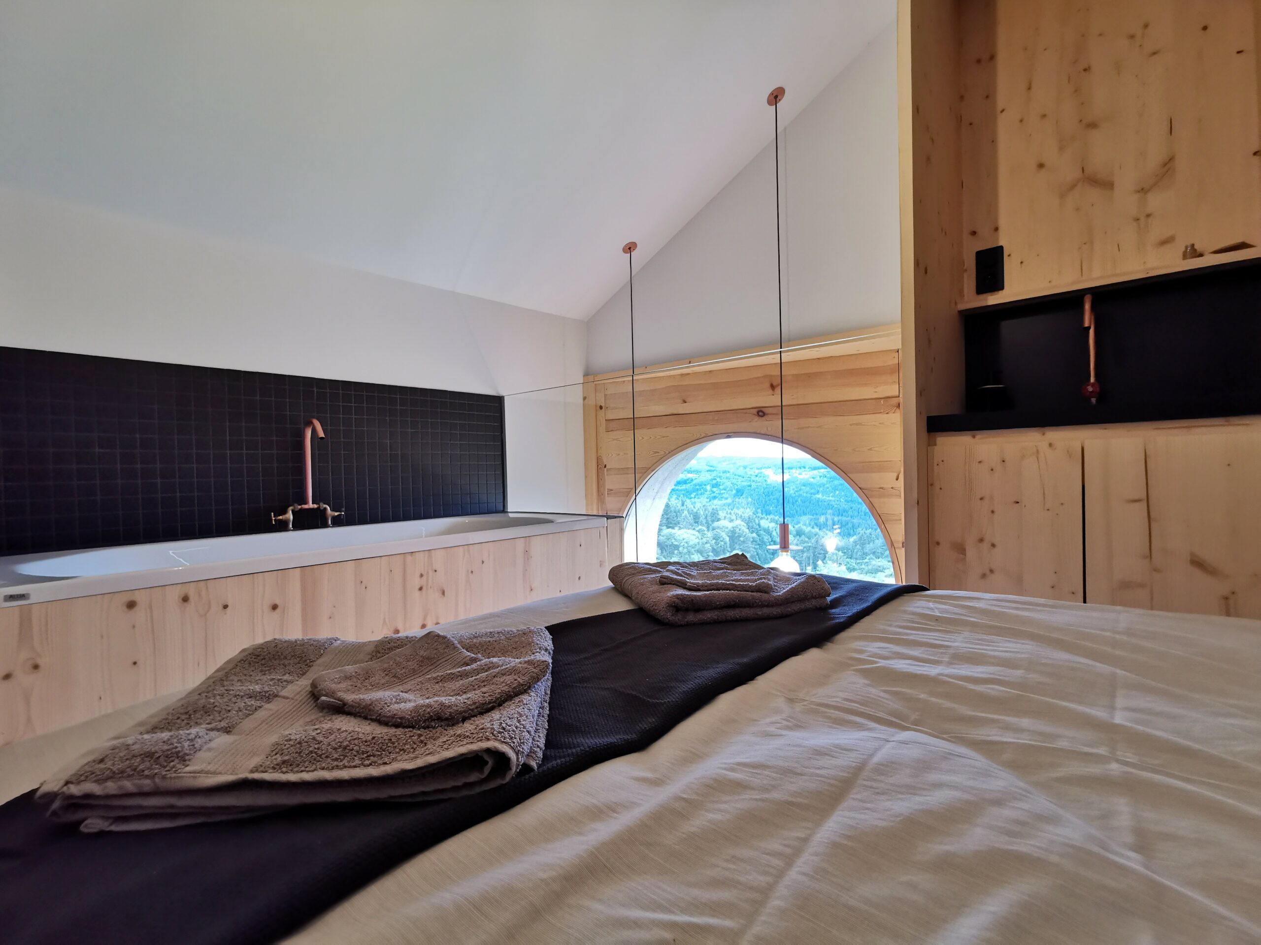 Deux modules : 4 pers avec mezzanine : 2 lits doubles – douche – baignoire – WC – TV