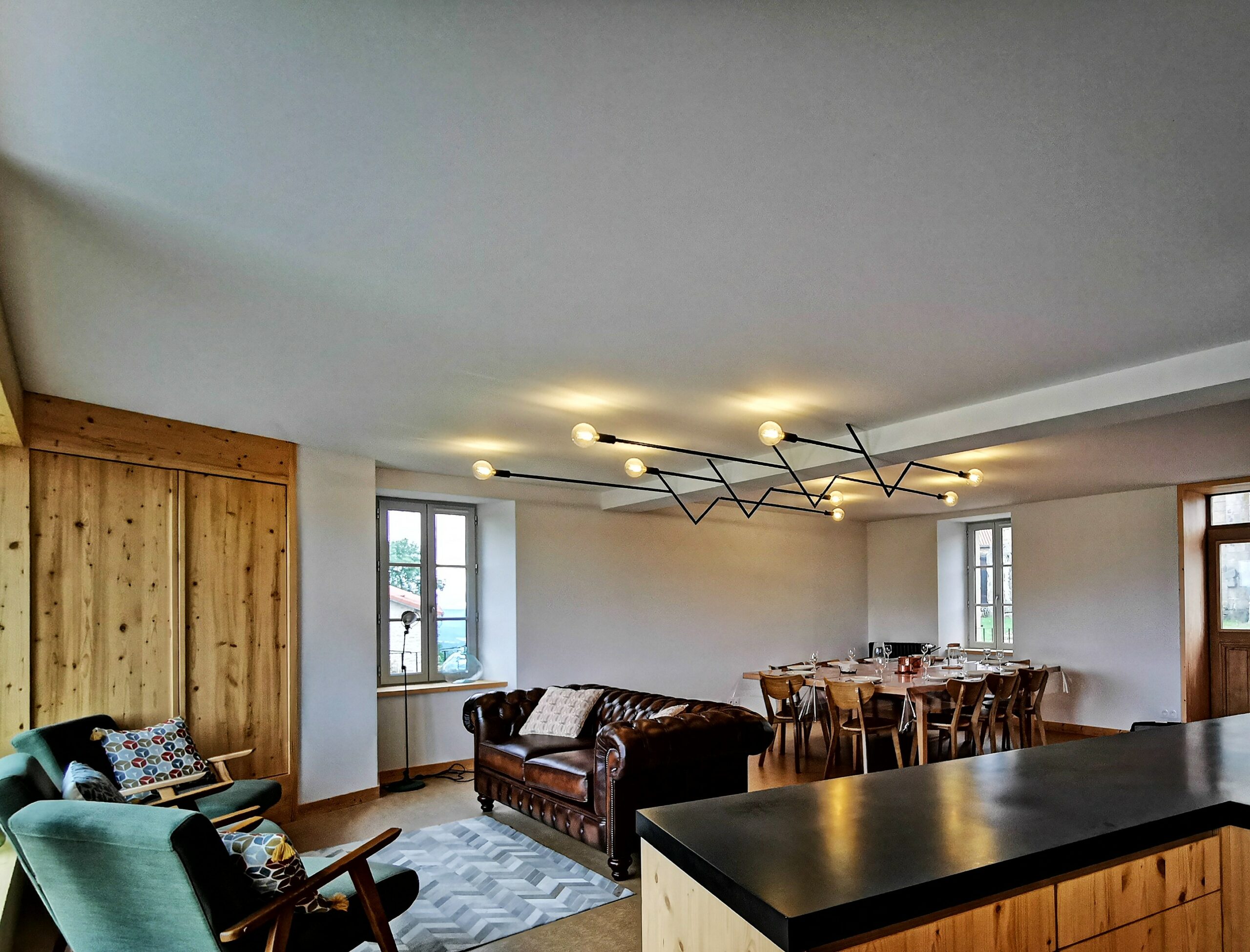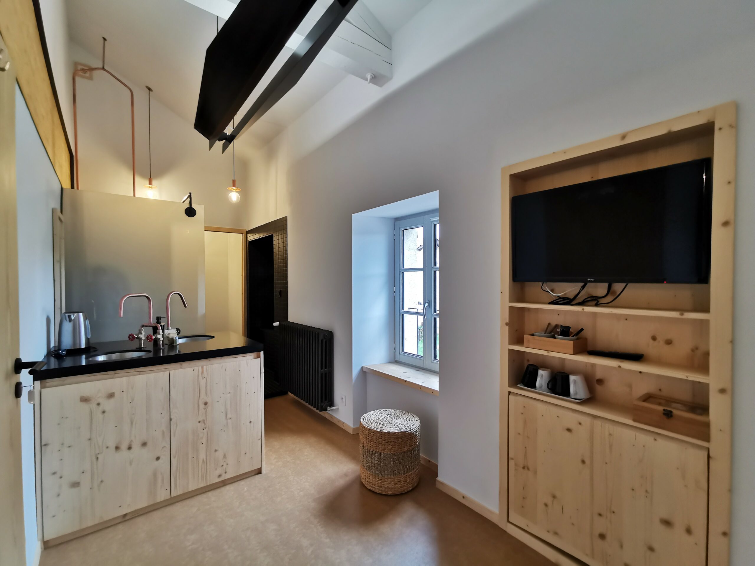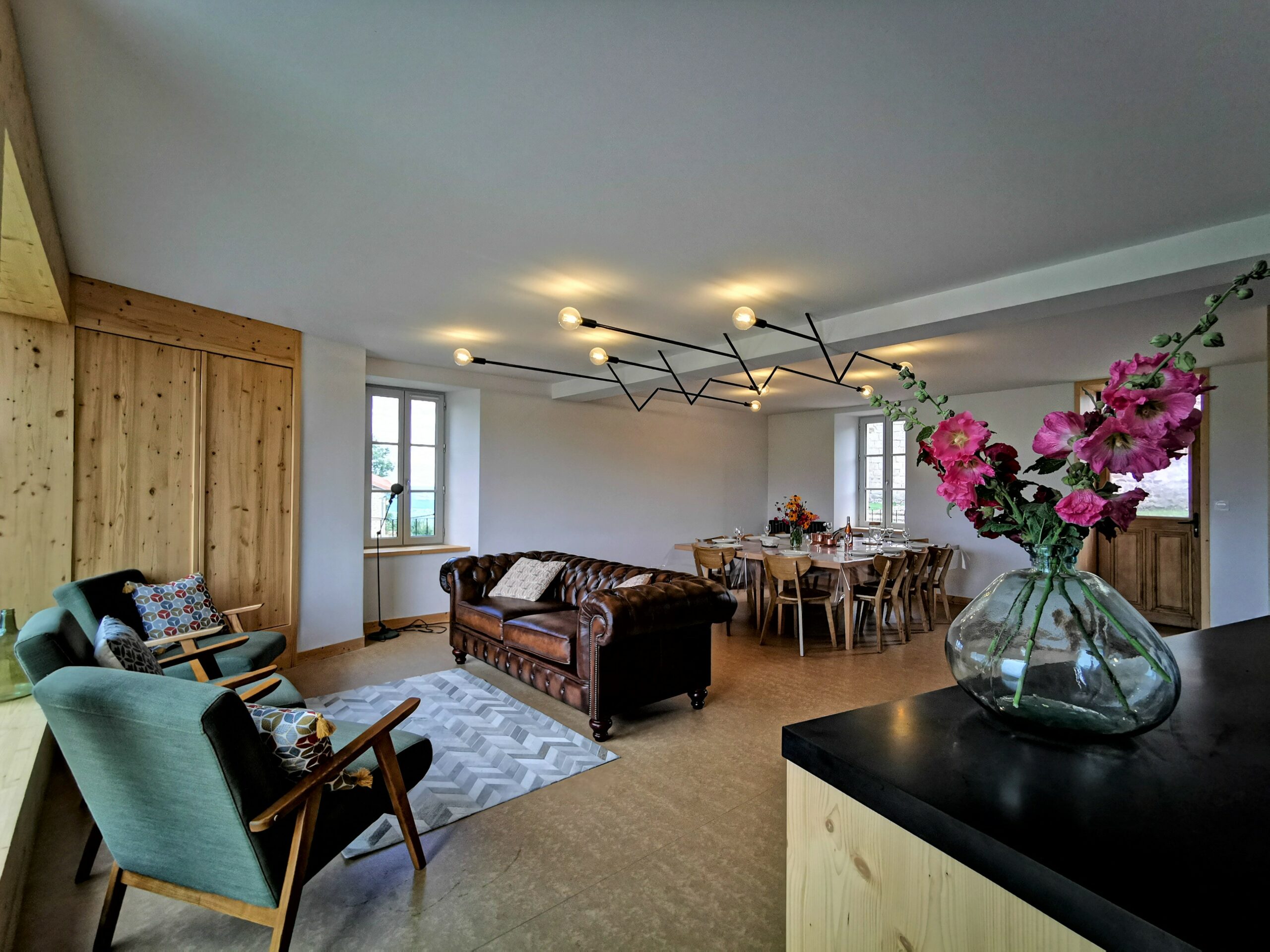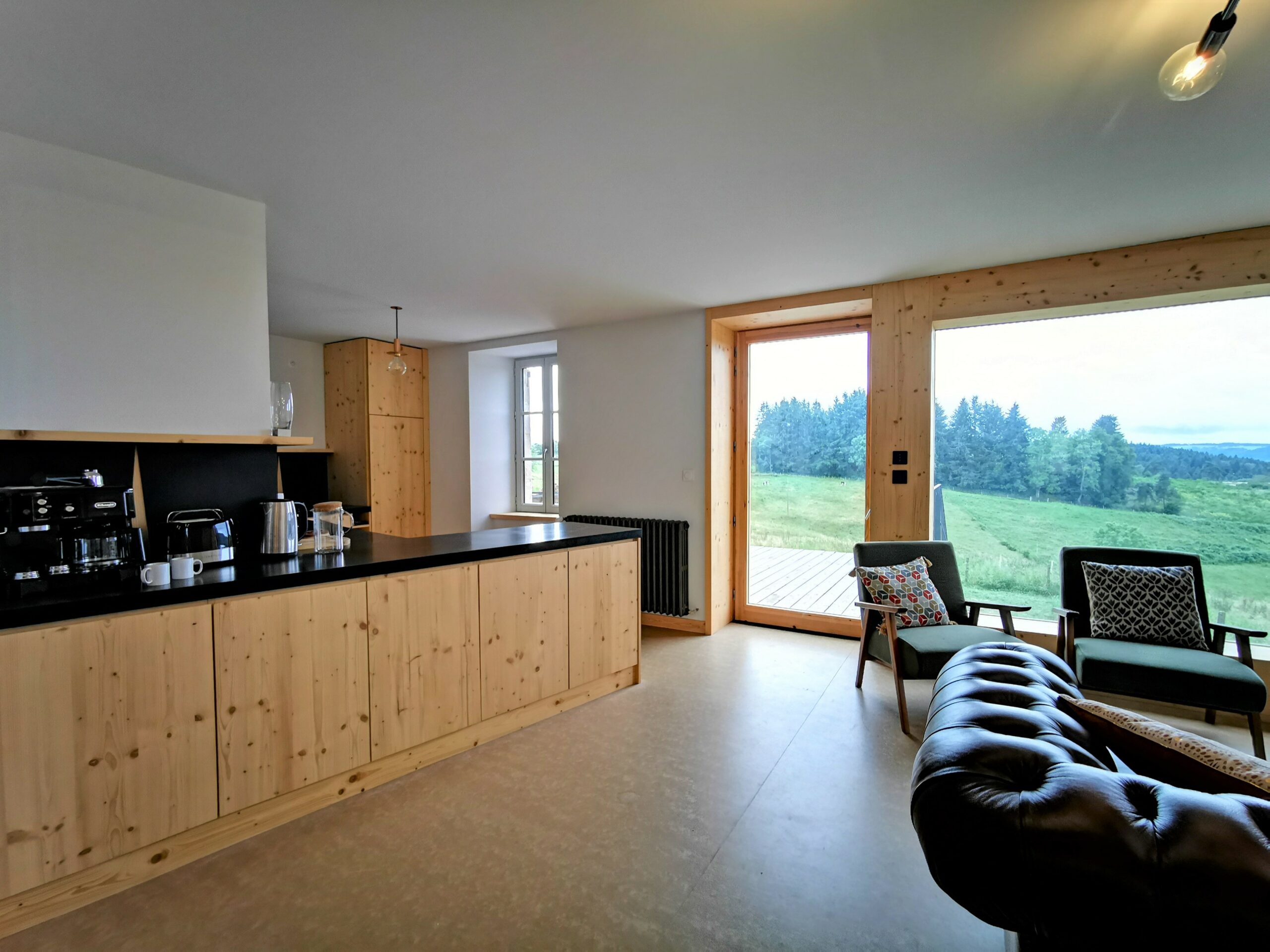 Grande pièce à vivre avec séjour, coin salon, cuisine aménagée (frigo/congélateur – lave vaisselle – micro-ondes).